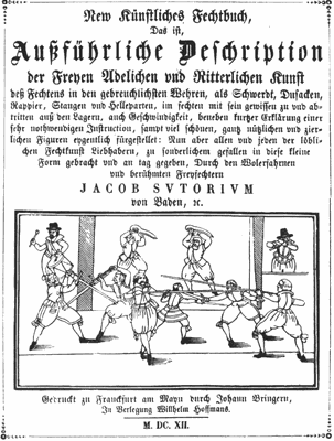 The following are translations of pages from Neu Kunstliches Fechtbuch dealing specifically with the longsword. The longsword section runs from page 2 to page 19. Sutor's fechtbuch draws heavily from Meyer and the miniscule longsword section is included as the book's first weapon for little apparent reason other than tradition. I translated this and include it for curiousity's sake. This fechtbuch signifies the waning role of the long sword, it is primarily a rapier and dusack treatise which borrows heavily from Meyer's much more impressive work.